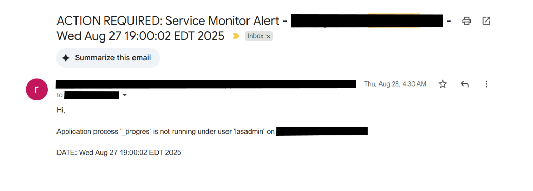 During a real-world production setup, I implemented an email alert monitoring solution to immediately notify the support team when any Progress service stopped working.