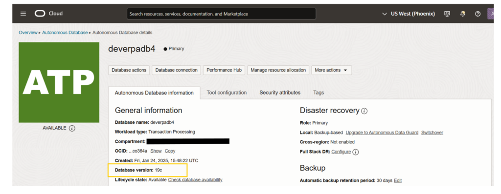 - Verify the Oracle Database version for your Autonomous Database instance is Oracle Database 19c.