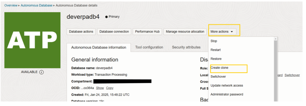 - Once all the details are given, click on the create autonomous database clone option at the bottom of the screen to upgrade the database from 19c to 23ai. This will create a clone version of the actual 19c database by upgrading the version to the latest 23ai.